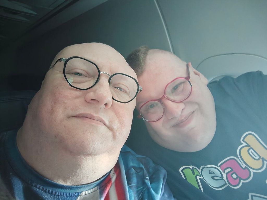 It’s the first time I’ve been on a plane since 1999. I wouldn’t even be on one now if we weren’t trying to keep the trip as short as possible to get back to the cats, but when you have special-needs kitties, you don’t want to be away too long.